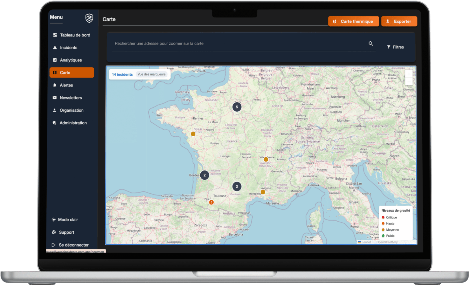 Conçu pour les directions sûreté, Incidents Watch facilite la manière avec laquelle les incidents sont gérés, suivis et analysés. Il centralise toutes les déclarations au sein d’un tableau de bord unique, simplifie les processus de résolution et génère automatiquement des indicateurs clés. Grâce à une cartographie interactive et à des alertes paramétrables, il offre une vision immédiate et complète de la situation sur le terrain.